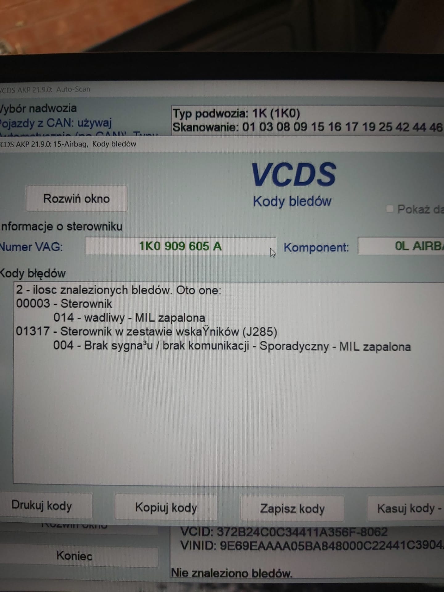 Skanowanie VCDS i sensor 1K0909605A generuje błąd Airbag Fault. (poduszka powietrzna od strony pasażera).